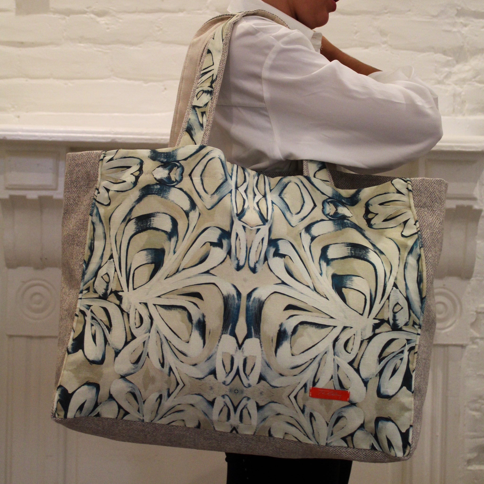 Talley Textile Fabric Tote in Dungarees Pattern Fabric. The Totes are sturdy and strong with an interior pocket. Take yours anywhere! 19" wide x 14" high x 9" deep